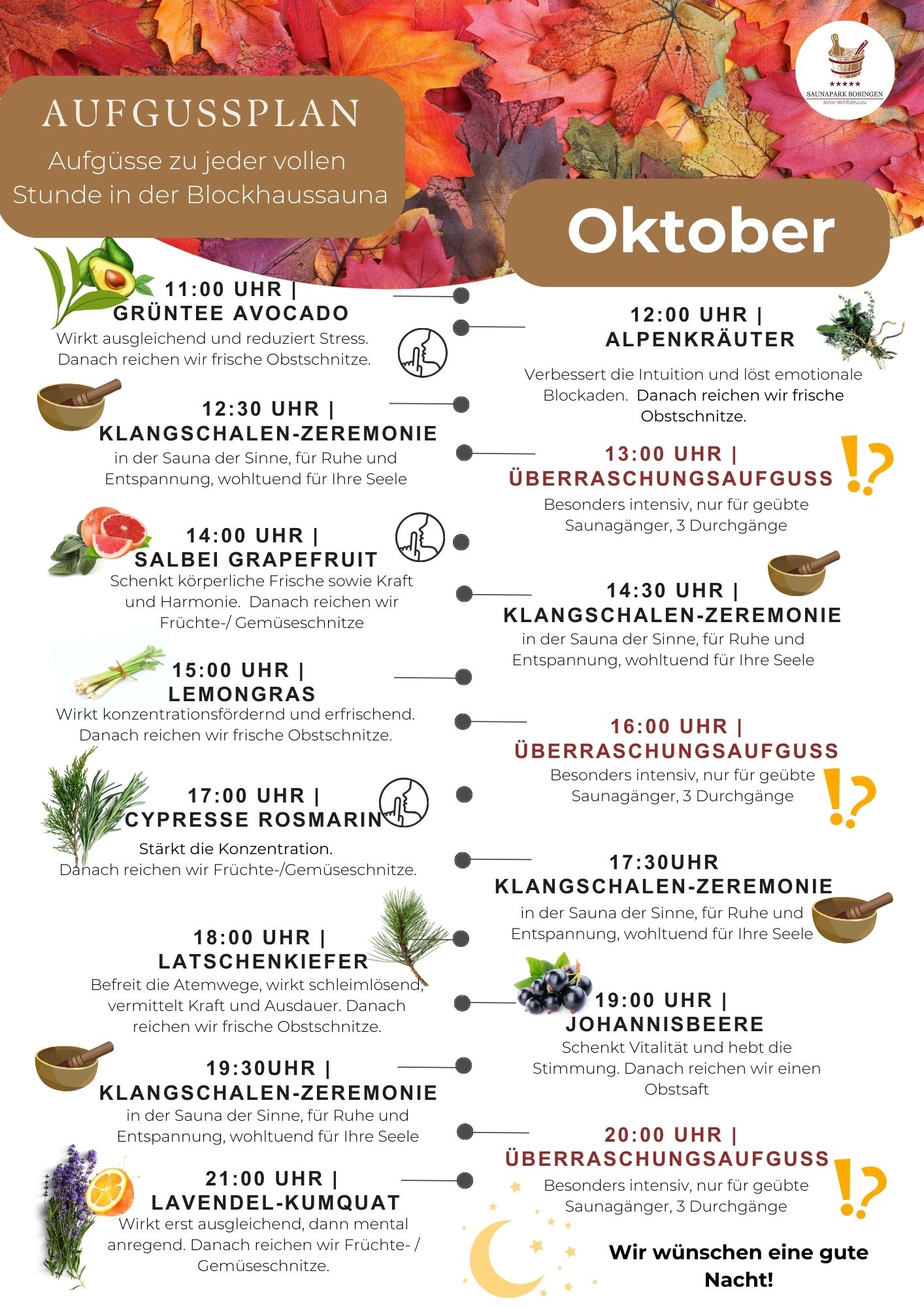 Im Saunapark Bobingen bei Augsburg gibt es jeden Tag unterschiedliche Aufgüsse von ausgebildeten Saunameistern. Bei der Auswahl der Aufgüsse achten wir sowohl auf den wohltuenden Geruch, als auch auf die positiven Auswirkungen auf den Körper und den Geist. Es gibt belebende und entspannende Aufgüsse. Sprechen Sie gerne unsere kompententen Mitarbeiter*innen an, wenn Sie Details wissen möchten. Diese freuen sich immer, ihr Wissen zu teilen.