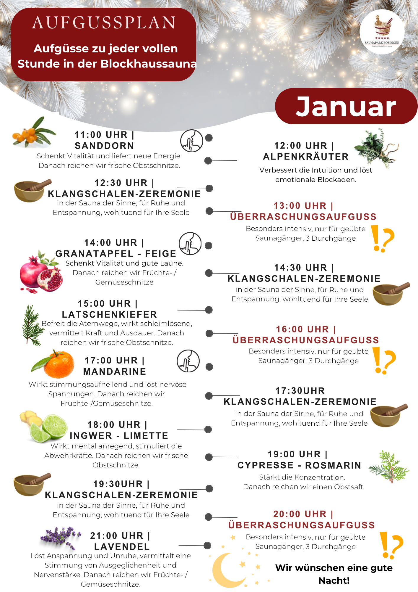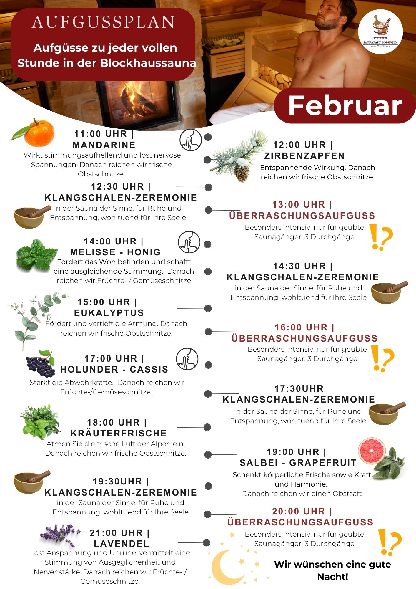 Im Saunapark Bobingen bei Augsburg gibt es jeden Tag unterschiedliche Aufgüsse von ausgebildeten Saunameistern. Bei der Auswahl der Aufgüsse achten wir sowohl auf den wohltuenden Geruch, als auch auf die positiven Auswirkungen auf den Körper und den Geist. Es gibt belebende und entspannende Aufgüsse. Sprechen Sie gerne unsere kompententen Mitarbeiter*innen an, wenn Sie Details wissen möchten. Diese freuen sich immer, ihr Wissen zu teilen.