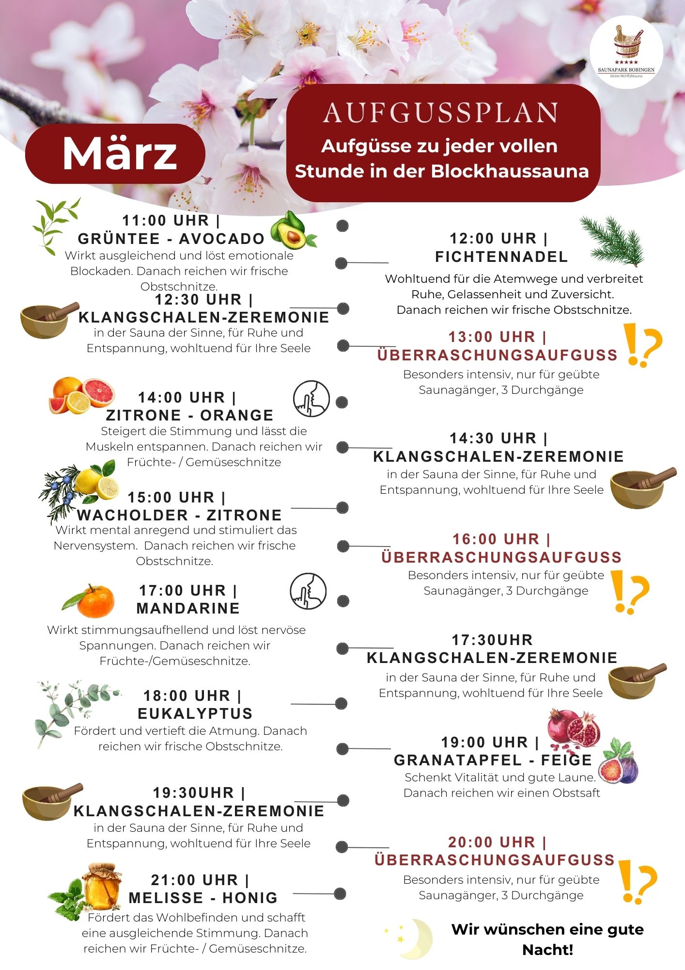 Im Saunapark Bobingen bei Augsburg gibt es jeden Tag unterschiedliche Aufgüsse von ausgebildeten Saunameistern. Bei der Auswahl der Aufgüsse achten wir sowohl auf den wohltuenden Geruch, als auch auf die positiven Auswirkungen auf den Körper und den Geist. Es gibt belebende und entspannende Aufgüsse. Sprechen Sie gerne unsere kompententen Mitarbeiter*innen an, wenn Sie Details wissen möchten. Diese freuen sich immer, ihr Wissen zu teilen.
