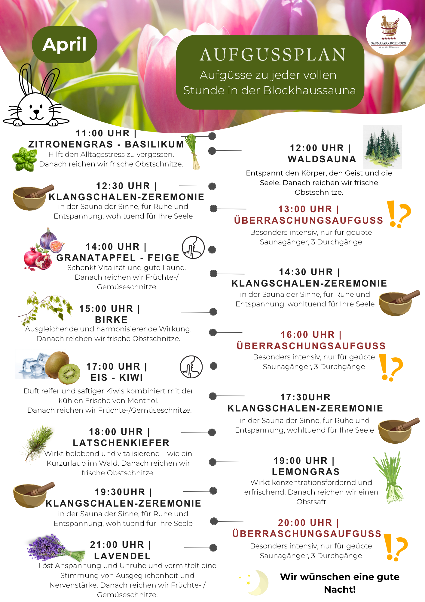 Im Saunapark Bobingen bei Augsburg gibt es jeden Tag unterschiedliche Aufgüsse von ausgebildeten Saunameistern. Bei der Auswahl der Aufgüsse achten wir sowohl auf den wohltuenden Geruch, als auch auf die positiven Auswirkungen auf den Körper und den Geist. Es gibt belebende und entspannende Aufgüsse. Sprechen Sie gerne unsere kompententen Mitarbeiter*innen an, wenn Sie Details wissen möchten. Diese freuen sich immer, ihr Wissen zu teilen.
